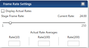 This panel will allow you to display and change the current frame rate of the application, both the defined rate (displayed as Current Rate) and the actual rate, averaged over 10, 100 and 200 frames.