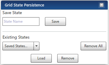 This panel enables you to save and restore the state of the KineticGrid to a named state. Among the aspects to be saved are the column positions, visibility, and widths. At any point, a saved state can be loaded which will apply the state immediately to the grid.