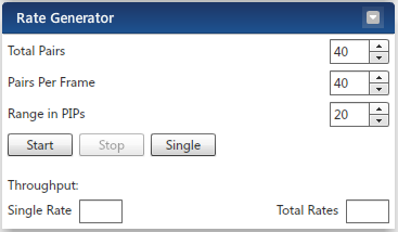 This panel allows you to pump rates into the model on a discrete or continuous basis. The Buy/Sell price for each currency pair starts off at the application-defined start price, then increments by a single pip each frame, until the maximum range is met. The price will then decrease until the minimum value is met.