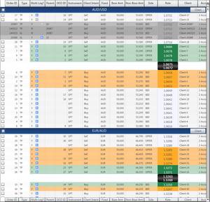 The position of the Buy/Sell price and color coding of each order is updated every time the rate for the currency pair changes. As all orders are sorted within the model, the grid disables column sorting.